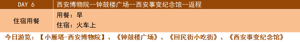 早餐后,游覽【小雁塔-西安博物院】(參觀約2小時),(每周二閉館一天)西安博物院在國內(nèi)博物館(院)中獨樹一幟,以千年古塔園林式遺跡休閑景區(qū)以及古都西安現(xiàn)代型歷史博物館而聞名。小雁塔即“薦福寺塔”,位于西安城南薦福寺內(nèi),與大雁塔相距三公里。因低于大雁塔,故稱“小雁塔”,小雁塔在漫長的歲月里,經(jīng)受了1200多年風雨的侵襲和70余次地震的考驗依然屹立不倒,令人嘆服古代能工巧匠高超的建筑技藝,近距離的觸摸這千年古剎。中餐后參觀我國目前規(guī)模最大,建筑最宏偉,保存最完整的明代建筑之一【鐘鼓樓廣場】(約1小時)細細品味古長安八景之一“晨鐘暮鼓”的古老和悠遠;然后赴與鐘鼓樓近在咫尺的回民小吃一條街,品嘗特色小吃,后前往前往位于西安市建國路60號的西安事變紀念館(游覽約1小時),由三座磚木結(jié)構(gòu)的西式樓房構(gòu)成主體建筑,是震驚中外的西安事變發(fā)生地。后根據(jù)火車時間送往西安站,結(jié)束愉快的旅程!